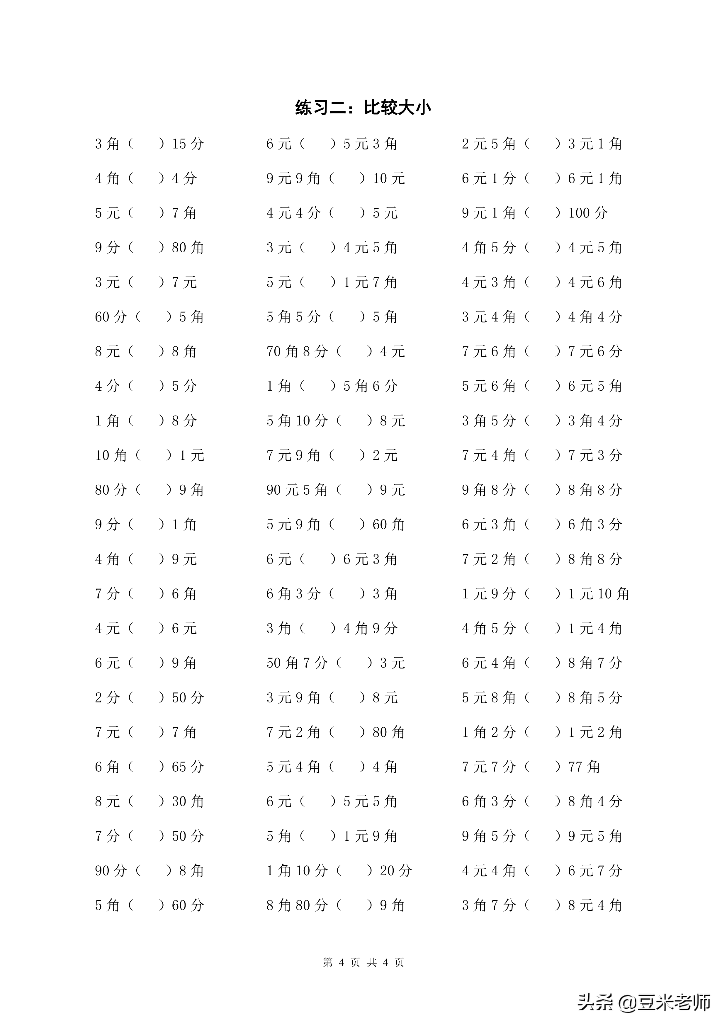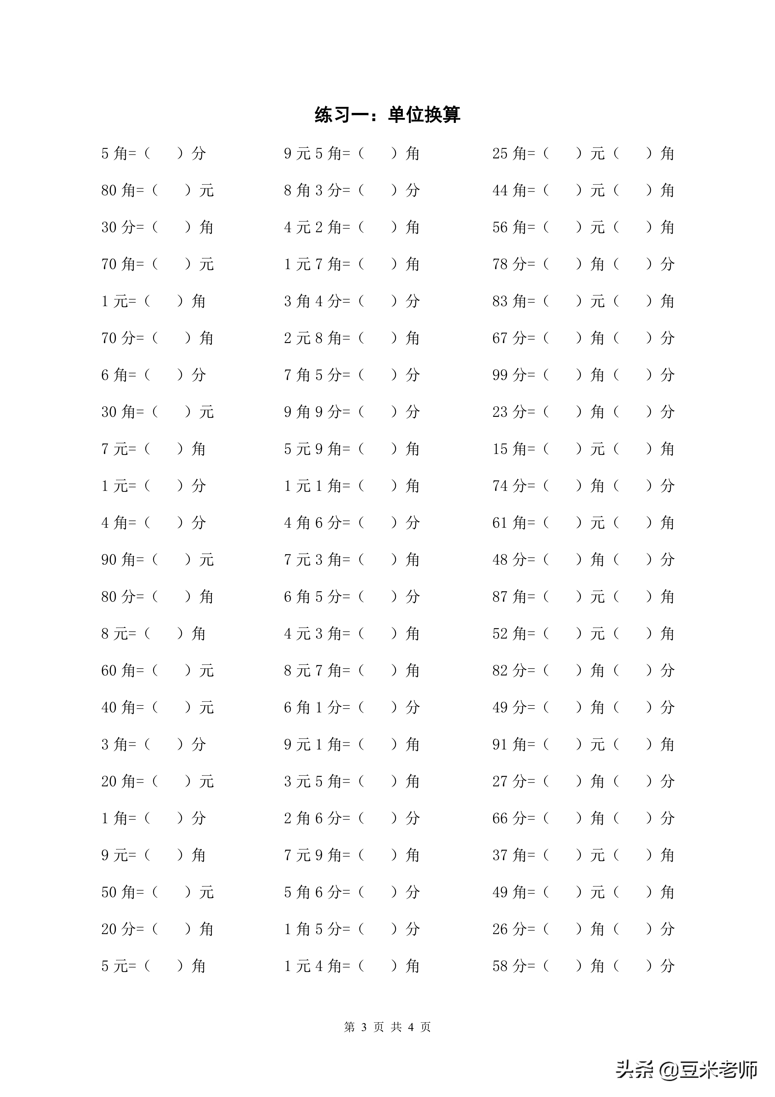 3.几元几角等于几十几角;几角几分等于几十几分。