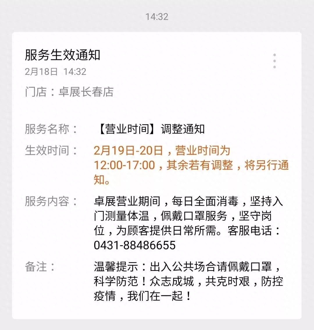 长春卓展营业时间调整通知