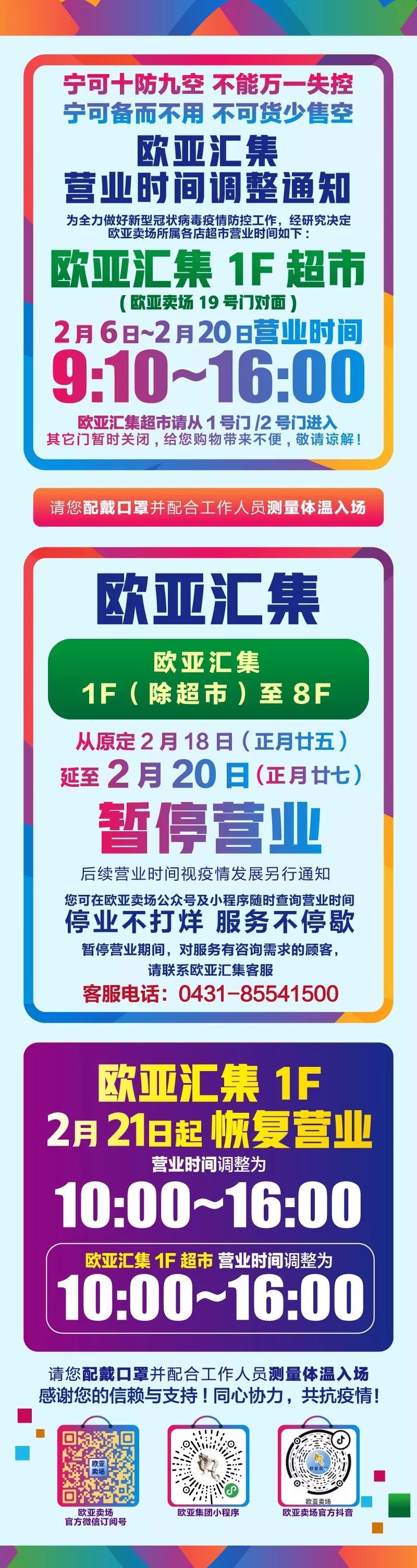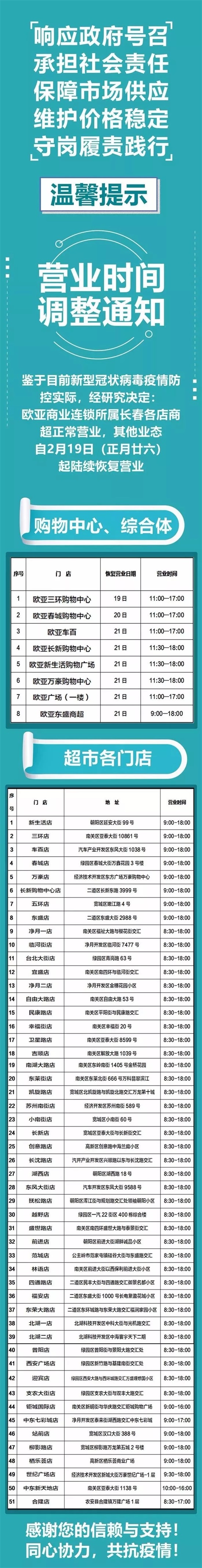 长春欧亚卖场、欧亚商都、欧亚各门店、卓展营业时间调整