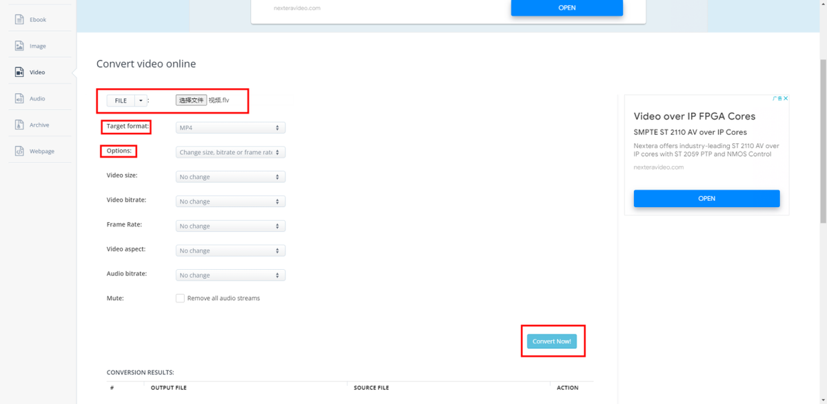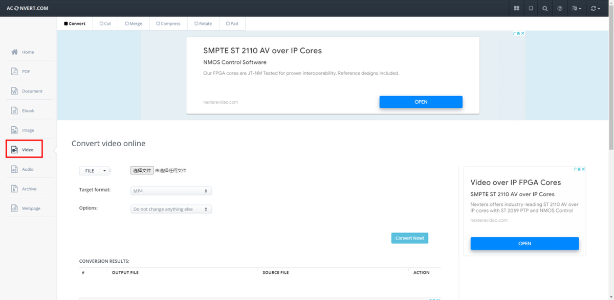 网站左侧就是各种文件分类,上方是功能选择,点击,第一个功能就是对视频进行转换了。