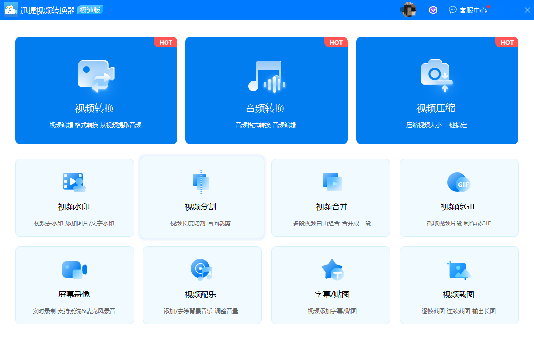 迅捷视频转换器就是一个专业的视频格式转换工具,支持多种视频格式转换,并且支持视频压缩、分割、合并、去水印、配乐等功能,也支持音频格式转换,功能比较丰富,但是软件很小,一点也不占内存~