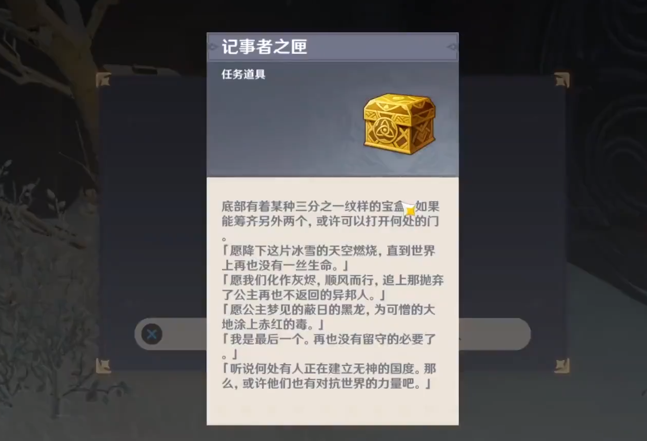 比如在雪山的右下角的悬崖峭壁中,有一个隐藏着的机关密室大门。玩家需要收集三个宝匣才能解开机关,进入密室大门。这三个宝匣分别是【公主之匣】【祭司之匣】和【记事者之匣】,三个宝匣散布在雪山的各个区域。如果是没有看攻略而是自己探索就找到了这三个宝匣的玩家,那么足迹肯定遍布了整个雪山。这三个宝匣上记载的还有故事,是关于雪山这片古老地区在之前发生的事情。大概是之前在雪山这片地区的一个王国,雪葬之都这个名字想必玩家也能猜到什么。集齐三个宝匣之后就可以前往【雪葬之都.旧宫】下方的传送点,去找到密室大门。