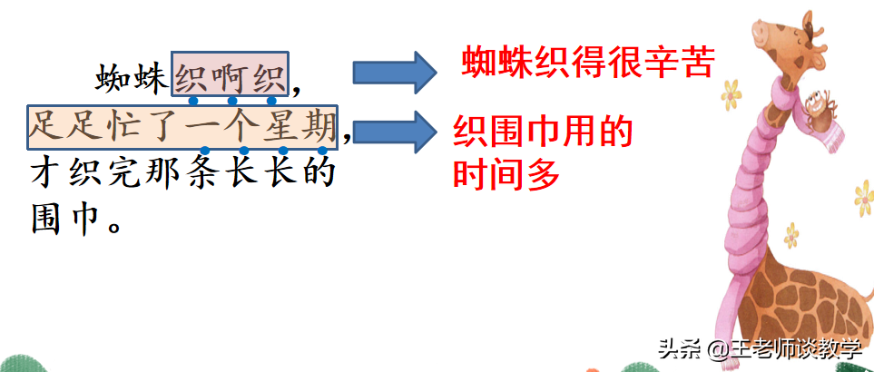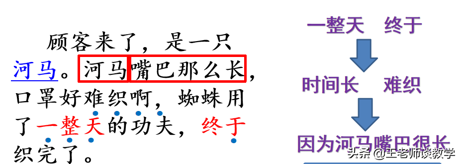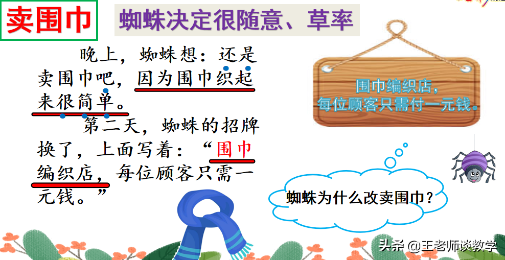 口罩店,因为河马嘴巴大,蜘蛛织了一整天;围巾店,因为长颈鹿的脖子很长,蜘蛛一个星期才织完;袜子店,因为蜈蚣的脚多,蜘蛛吓得跑回了网上。