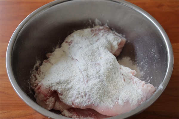 1、准备一块猪板油,把猪板油放在大盆中,先加入盐,反复搓洗一遍,再加入面粉,再次反复搓洗一遍;