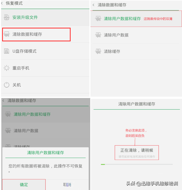 手机电量充足,在关机状态下按住电源键和音量键进入到recovery模式,选择清除用户数据和缓存,再点击“清除用户数据和缓存",点击确定后会自动进行刷机,清理完成后重启手机即可。