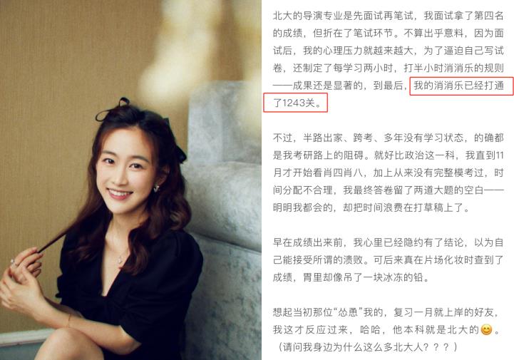 刘美汉自己说,她在研究生入学考试中在面试中获得了第四名,但心理压力越来越大。她还制定了一个特殊的学习计划,但最终的结果仍然令人遗憾。虽然她没有通过考试,但她的分数也肯定了她在这段时间里的努力,但她也提醒她努力工作是不够的。毕竟,这段时间最明显的结果是,她已经达到了1243级。