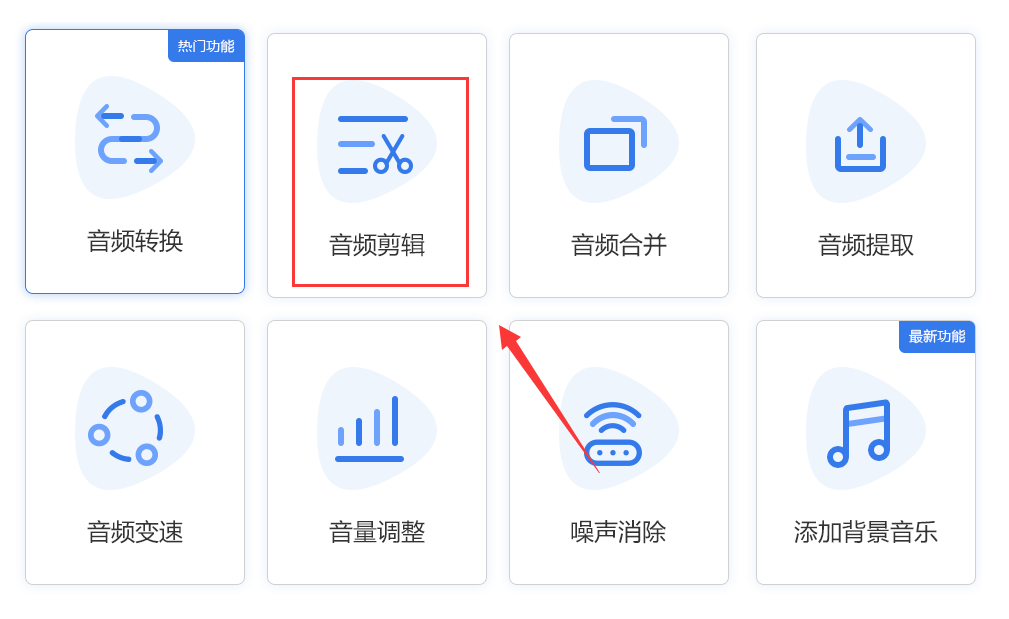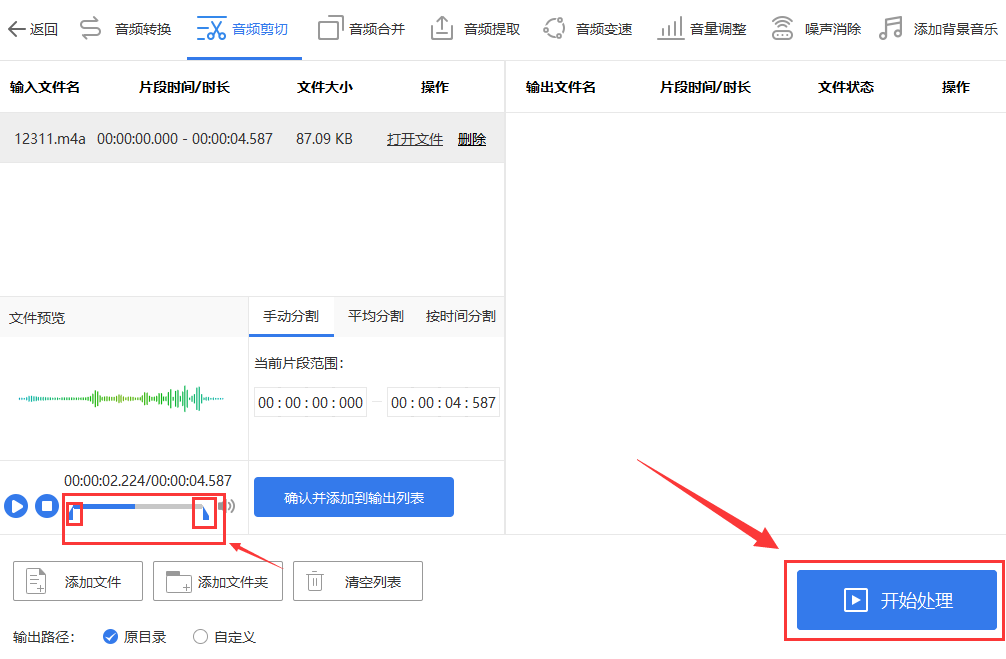 剪辑方法:我们打开软件后选择【音频剪辑】功能,然后将需要剪辑的音频导入进去,根据下面红色区域中的两个蓝色三角来选择自己需要的部分,最后全部完成之后点击右下角的【开始处理】即可。