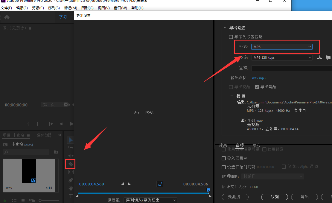 剪辑方法:前面的方法也剪映的都一样,我们通过剃刀工具来进行音乐的剪辑,然后在保存格式里选择MP3即可。