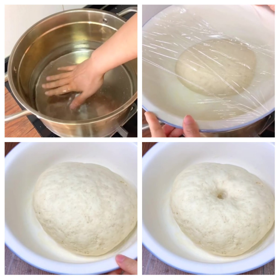 ②揉成光滑的面团之后,需要用保鲜膜将其盖住,如果室内的温度并不是很高,可以准备一口锅,里面放上30度左右的温水,然后将刚才的盆儿放入其中。