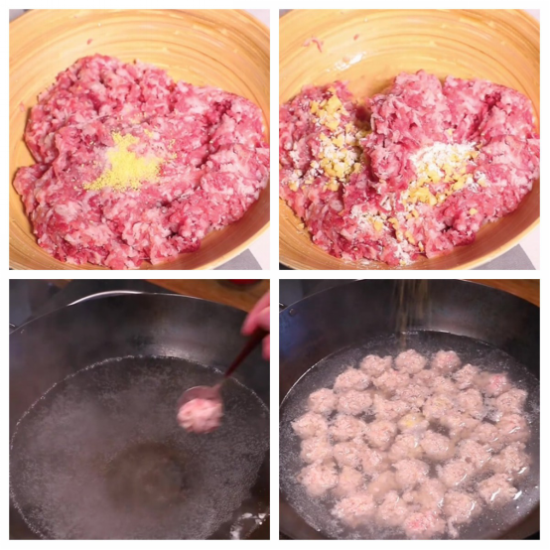 ②锅中放入清水,将刚才搅好的肉馅用勺子做成肉丸,然后放入锅中。全部放入锅中之后用盐、鸡精、胡椒粉调味,然后开大火煮开。