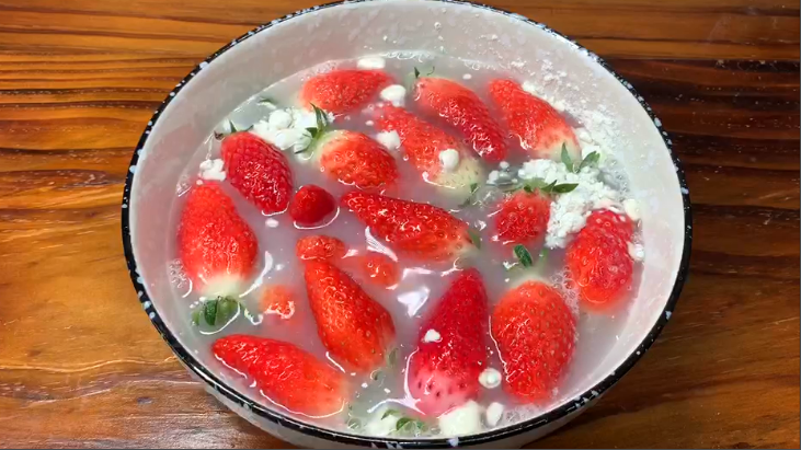 搅拌一会儿,再浸泡5分钟,这样草莓表面的脏东西、农药甚至虫软就彻底别吸附下来了,最后用纯净水冲洗干净,这样清洗的草莓特别干净,也不破皮,非常省事省力。