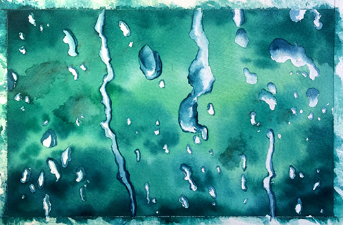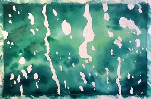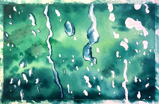 1 、这次我们还是用到了留白液,加些水稀释一下,注意疏密结合,曲曲折折,点线结合画出雨滴。