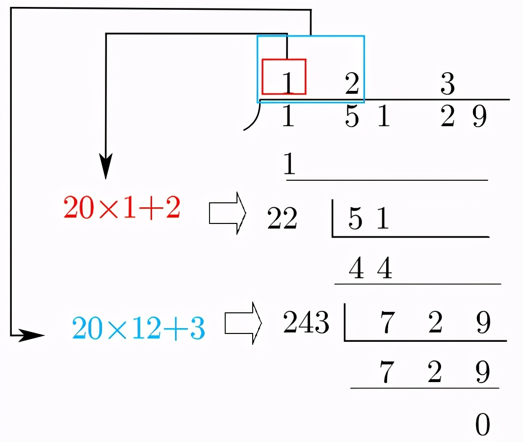 我们再举一例,求15129的平方根。先将数每两位分一节1,51,29;分成三节对应平方根是一个三位数(用字符abc表示),最高节1,对应根的最高位1(a=1),现在确定根的第二位和第三位(十位和个位),按照上例的方法确定根的第二位为2(b=2)。确定了b,接下来,再次相减,即把刚确定的(20a+b)b减掉,从而再次获得新余数7,然后下移两位,移下来组成新数729。因为(100a+10b+c)²=(100a+10b)²+2(100a+10b)c+c²=(100a+10b)²+20(10a+b)c+c²=(100a+10b)²+[20(10a+b)+c]c,所以再次将已经确定的根的前两位乘以20(即(10a+b)×20 )加c ,用这个数除729,来确定平方根的第三位c(即用[20(10a+b)+c]c来逼近729),从而可以确定根的第三位c=3。具体过程如下(算出15129的平方根是123):