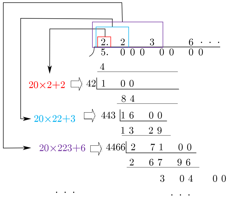 如果一个数的平方根有更多位,只需将上述方法重复,每一步的余数和被开方数的下一节(两位下移),组成新余数,再用已试出的根的前几位乘以20去除这个新余数,商几就将除数加几,再确定这一步的余数,循环计算直到余数为0或者无限循环计算下去(当然有开不尽的数)。
