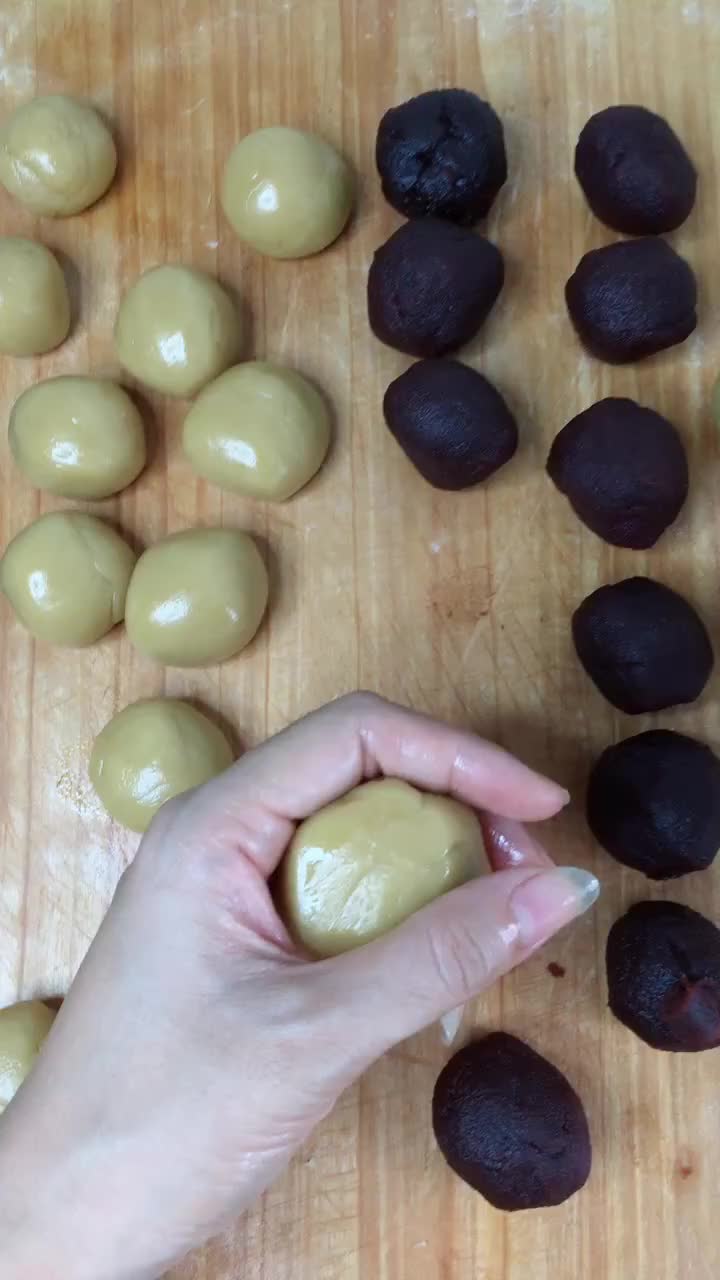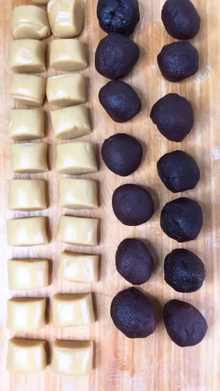 3、待面团醒好后,先把它分成15克一份的剂子,用它来制作月饼皮,豆沙馅的分的分量稍微大些,每粒35克左右,将它们各自分好后,分别将它们摆放在案板的两侧,如上图所示。
