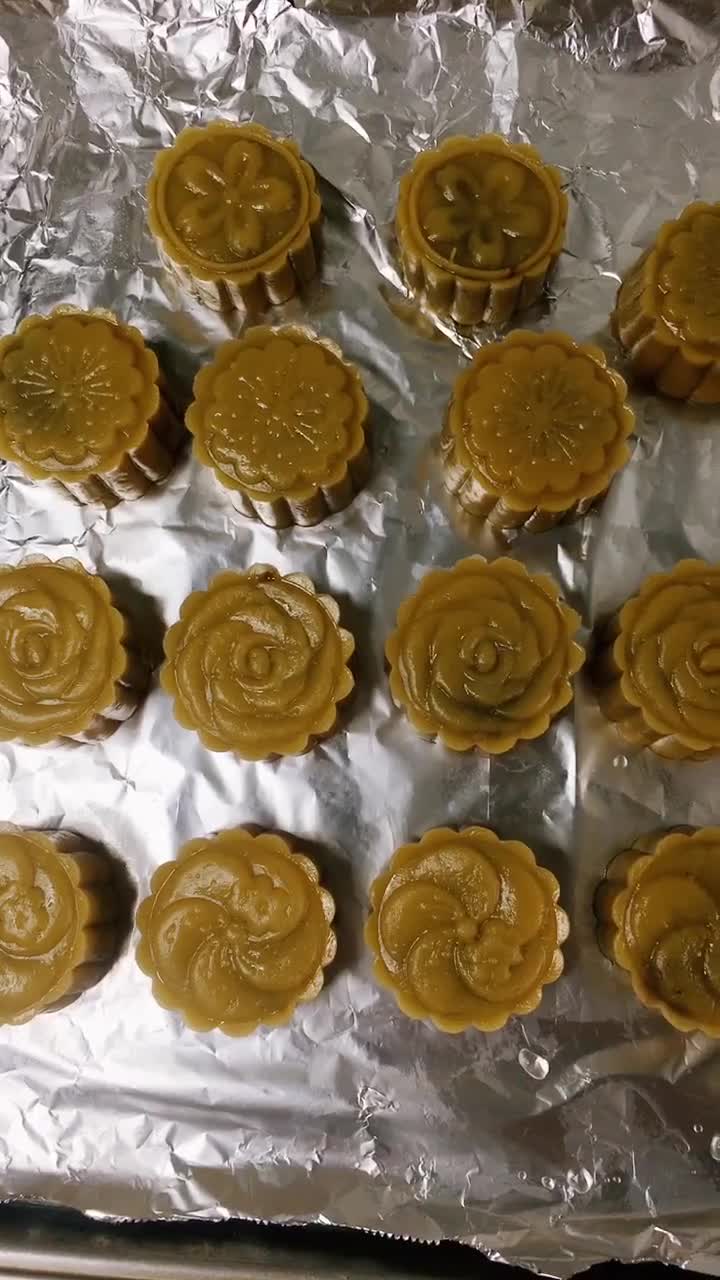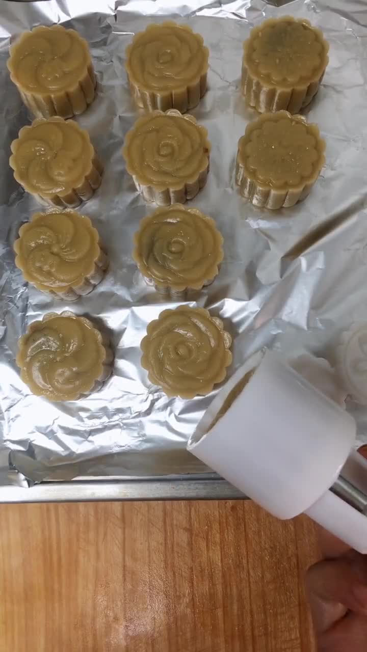 5、在烤盘中铺上一层锡箔纸,再将压好的月饼逐一摆入盘中,放入烤箱之前再喷入少许的水,防止烤干。