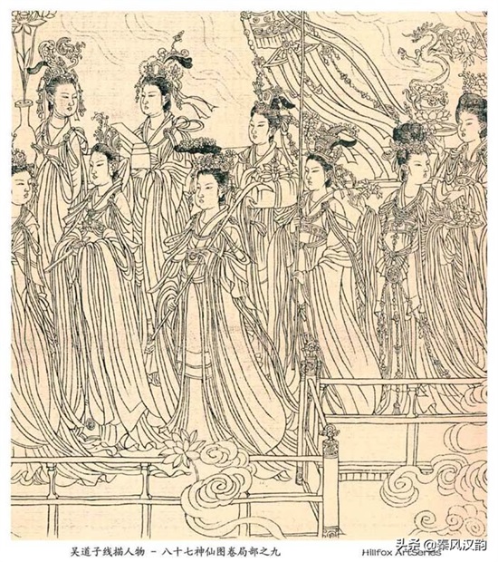 到了中年以后,一改顾恺之以来的主线型,创造了一种波折起伏,错落有致的“莼菜条”式的描法。用这种描法画人物的衣袖、飘带、具有迎风起舞的动势,故有“吴带当风”之称。