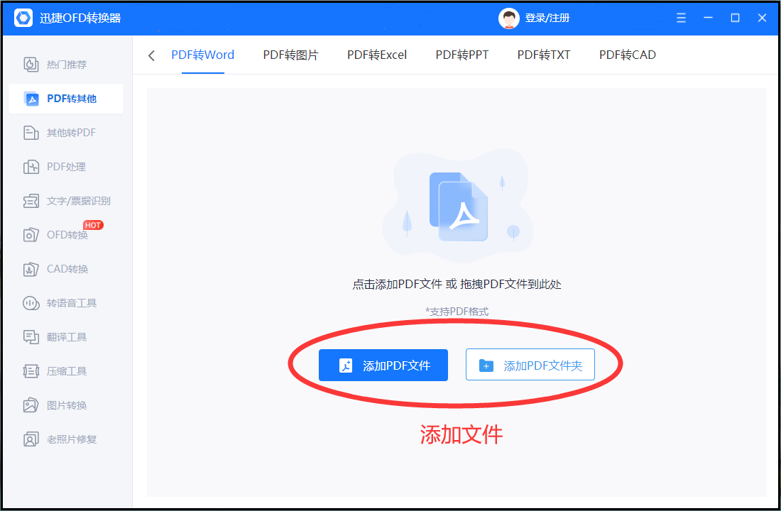 ② 进入后点击添加PDF文件或者是文件夹,也可以直接把PDF文件拖拽进来转换,这里设计的就比较人性化,方便操作。