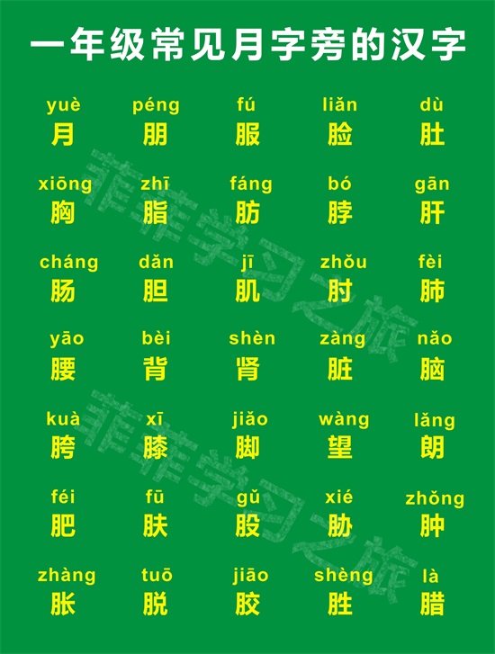 我们了解了这些知识,在一年级的学习中可以很好地积累常见的月字旁的汉字,比如有:月、朋、服、脸、肚、胸、脂、肪、脖、肝、肠、胆、肌、肘、肺、腰、背、肾、脏、脑、胯、膝、脚、望、朗、肥、肤、股、胁、肿、胀、脱、胶、胜、腊等等。