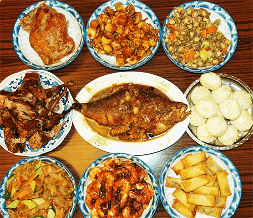 年夜饭,不但菜品丰富多彩,其中还多有寓意。传统上,吃年夜饭前要先拜神祭祖,待拜祭仪式完毕后才开饭。作为全家都要动员的大餐,家家户户都会摆上平日里很少见的,或是寓意吉祥的菜品:席上一般有鸡(寓意开年大吉)、鱼类(寓意年年有余)、汤圆(寓意团团圆圆)、年糕(寓意年年高)等菜品,以求吉祥讨喜,也寄予出人们对未年美好生活的无限期许。