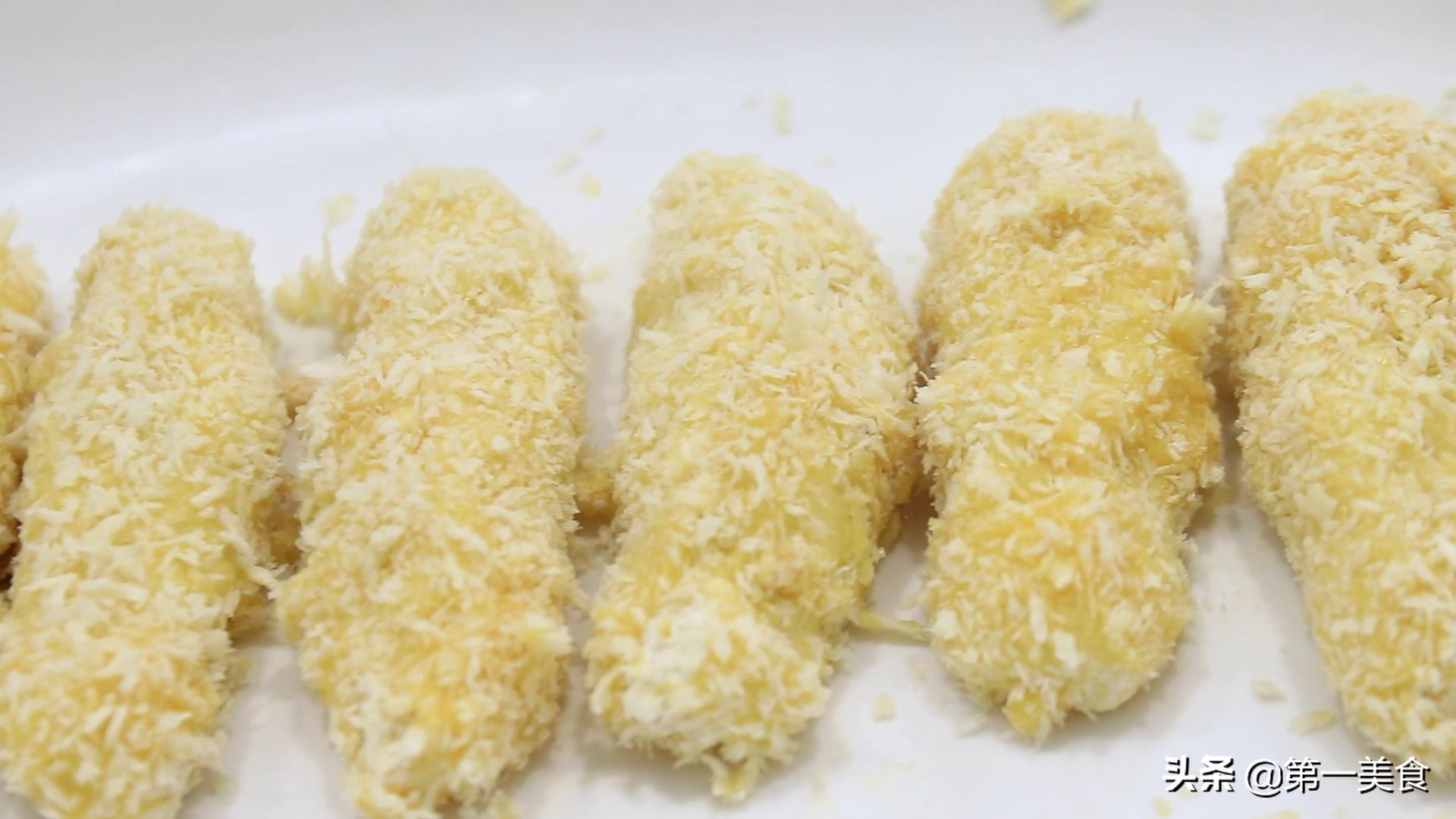 5.然后拿起土豆条,先在糯米粉中滚一下,再粘上鸡蛋液,最后裹上面包糠,按着这个顺序把土豆条全部裹好以后放在盘中。