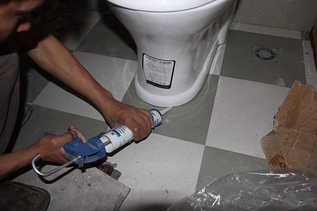 马桶对好位置之后,在马桶的外沿再打一圈玻璃胶,加固密封效果。