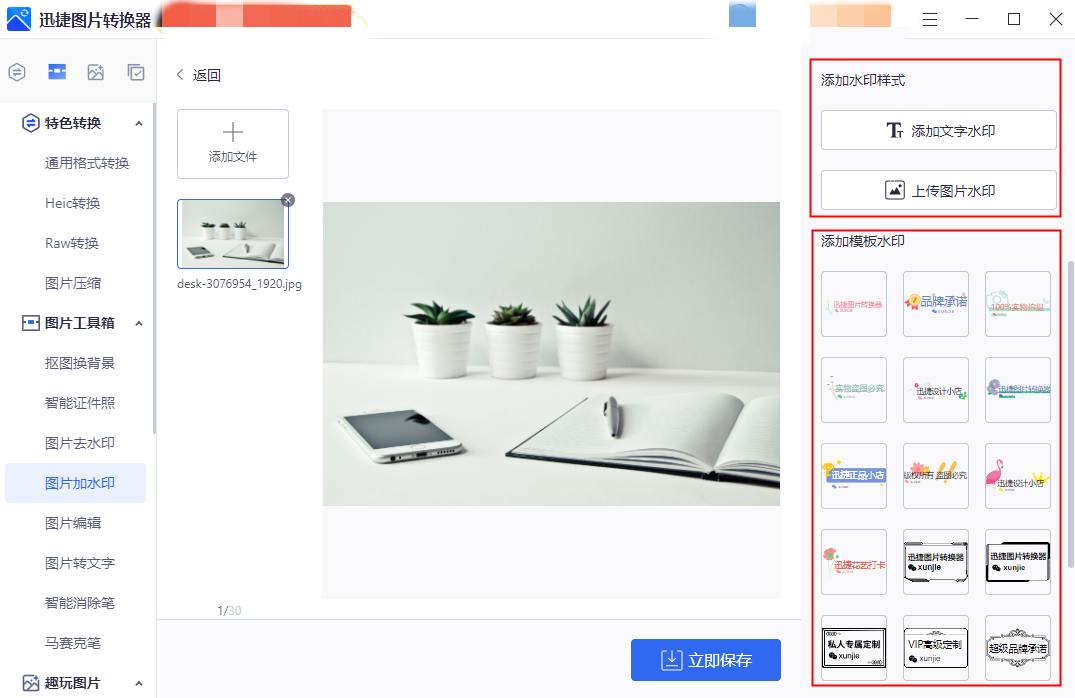 软件介绍:我们可以使用一些专业软件个图片加水印,这款迅捷图片转换器就是一个不错的选择。它内置了两种水印样式——文字水印和图片水印,还为我们提供了多种模板水印。我们可以自由调整水印的位置、透明度、样式等等,即使添加水印也不影响图片美观。