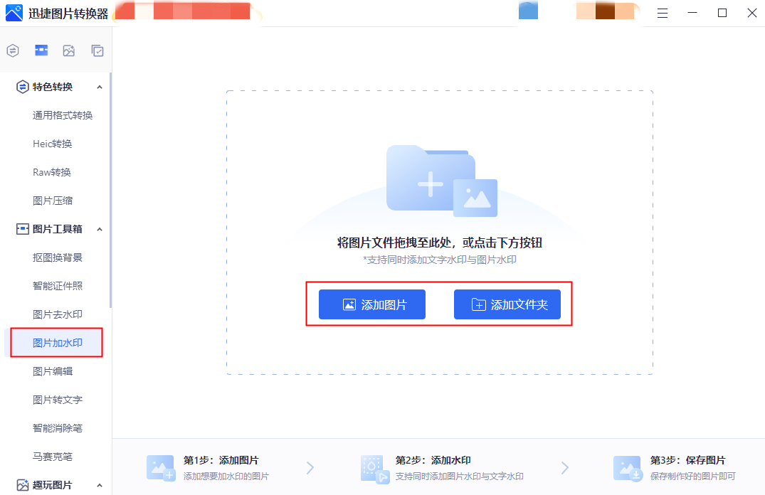 第一步:安装好该软件后打开,在左侧的图片工具箱中找到【图片加水印】,随后点击【添加图片】或【添加文件夹】导入图片。