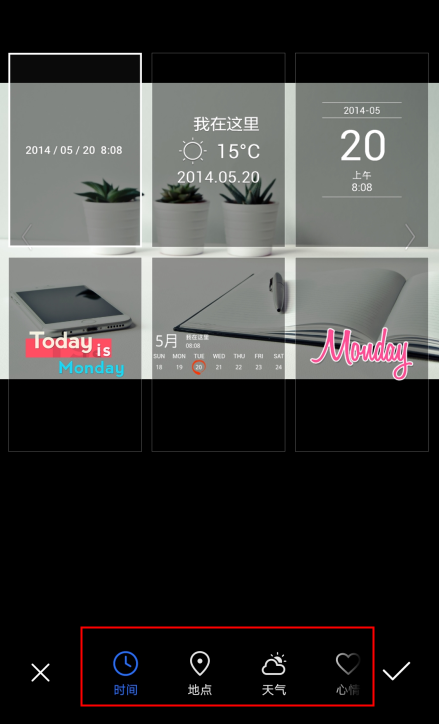第二步:我们可以看到它提供了时间、地点、天气等不同板块的水印样式。大家可以选择自己想要的水印进行添加,最后保存下来即可。
