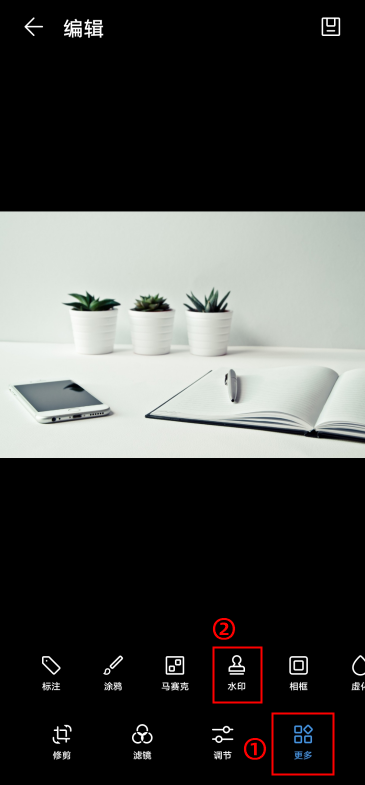 第一步:打开手机图库,选好目标图片,点击【编辑】功能,在【更多】中找到【水印】功能。