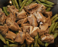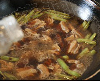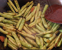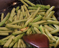 6. 放入豆角段,快速翻炒,让没根豆角都沾上油。