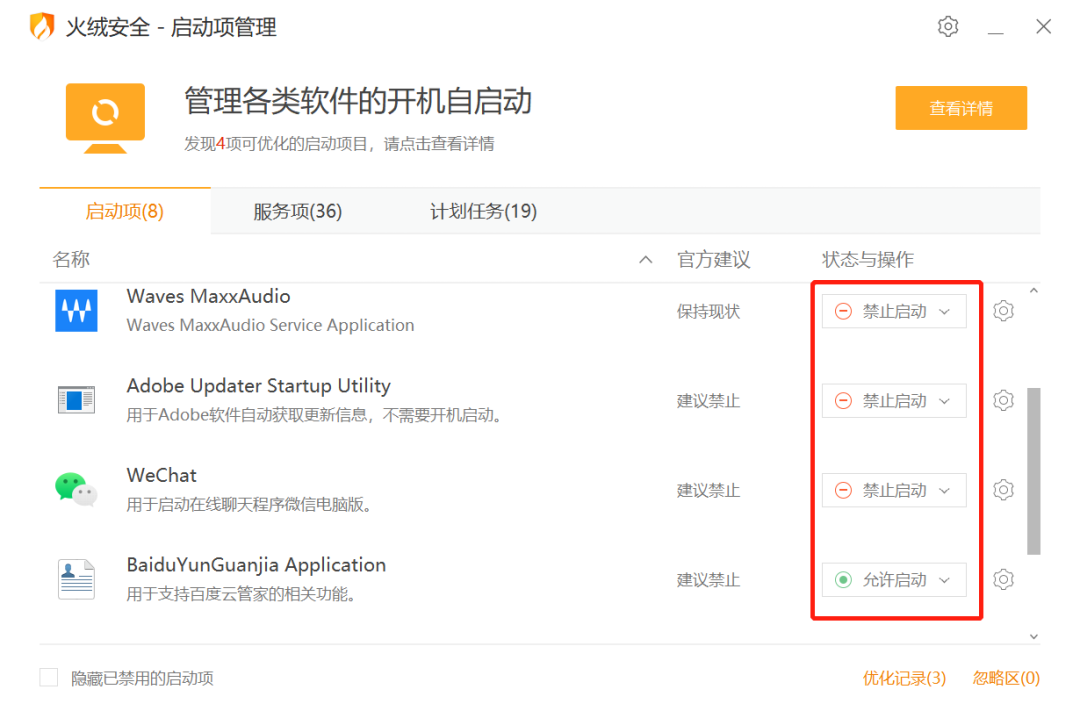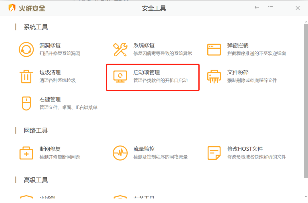 如果电脑上有三方安全软件,也可以在上面管理开机启动项,这里小编以火绒安全软件为例,给大家演示一下,如果你用的是其它安全软件,步骤上可能会有所不同,请根据实际情况进行操作。