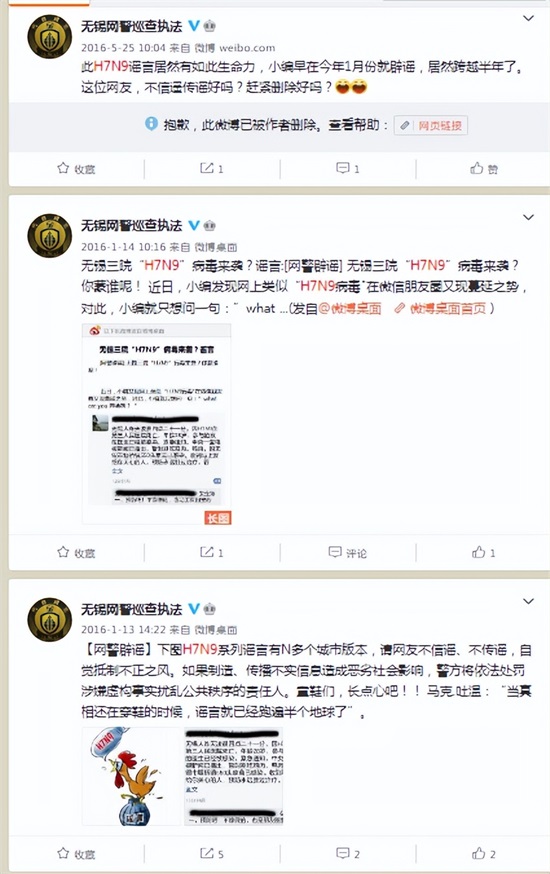 2016年,无锡网警曾3次辟谣H7N9谣言,无锡网警指出:内容一致,连时间都一样,仅仅替换城市的名字,造谣者,你太不认真了。H7N9系列谣言有N多个城市版本,请网友不信谣、不传谣,自觉抵制不正之风。