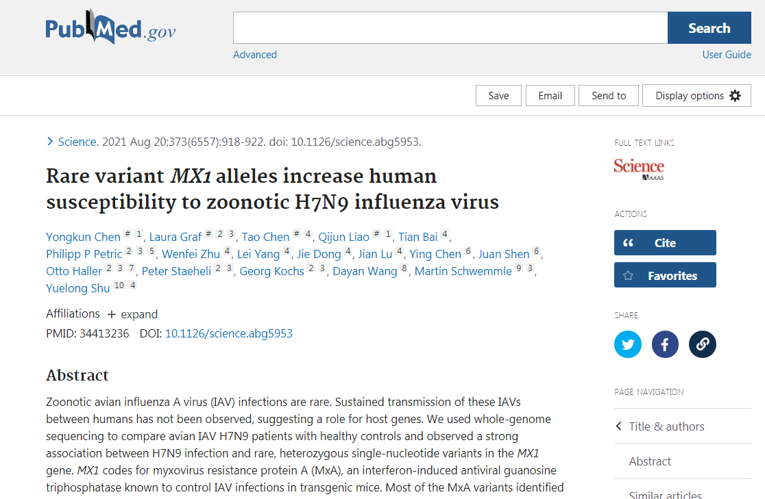 2021年8月舒跃龙教授团队发表Science期刊《Rare variant MX1 alleles increase human susceptibility to zoonotic H7N9 influenza virus》介绍:首次发现人MX1基因稀有变异可能增加人感染H7N9禽流感病毒风险。研究结果首次解释了相同暴露条件下,为何只有一小部分人会感染H7N9禽流感病毒这一流行病学现象,同时这些变异均为稀有变异。