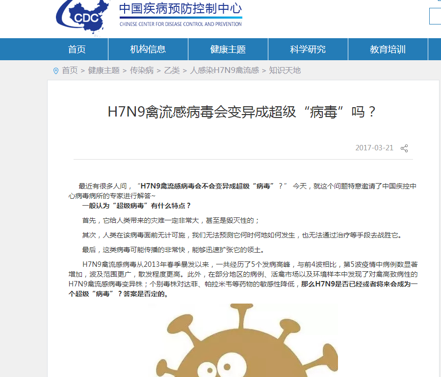 2017年3月,中国疾病预防控制中心科普:与其他亚型禽流感病毒类似,H7N9病毒主要通过直接接触活禽或暴露于活禽相关环境后感染人。H7N9病毒目前并不具备季节性流感病毒那种持续的人际传播能力,尚不会造成流感大流行。