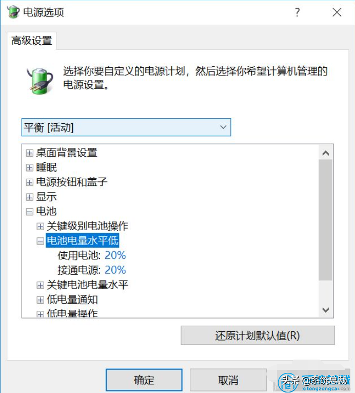 4、寻找【充电电池】 -> 【电池容量水准低】,将其设定高一些,例如20%或是高些(你认为电池容量小于百分之几就必须充电了,你也就将其设定为那一个值)。