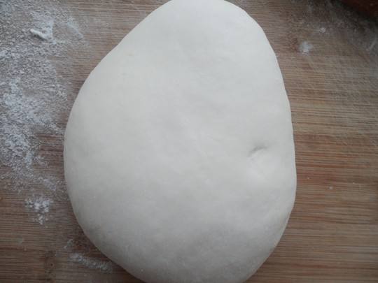 2:揉面——面团放在案板上,用力反复揉制,直到把面团揉匀揉光滑,成椭圆形状。