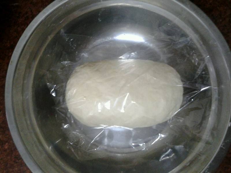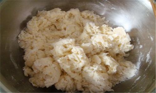 1:和面—— 盆内倒入面粉,用筷子扎几个小洞,倒入水,(一般是一斤面粉3两水,冬天用冷水,夏天用温水。)开始和面,把面和水搅拌均匀和好,盖上一块湿布,放在一边醒20分,揉好的面用手指往下压,手感发硬,按不下去,且不沾手。