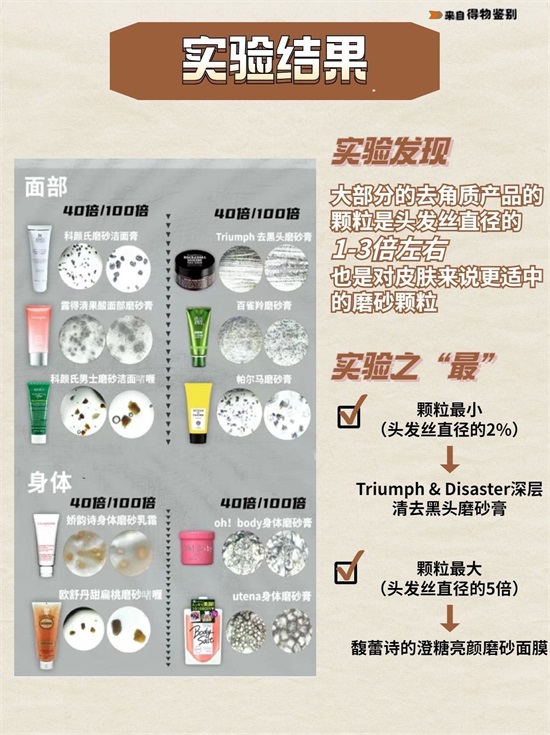可以看到市面上看到的去角质产品颗粒差异是非常大的,大家一定要根据自己的皮肤特征,有针对性地选择而且无论颗粒大小。