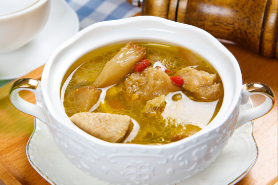 鸡汤是一道传统的汤菜,制作原料主要有鸡、水、调料等。鸡汤特别是老母鸡汤向来以美味著称,鸡汤还可以起到缓解感冒症状,提高人体的免疫功能的作用。