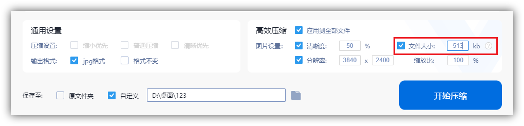 它可以把图片压缩到指定大小,勾选右侧的「文件大小」,输入理想尺寸,设置分辨率、清晰度和压缩比。