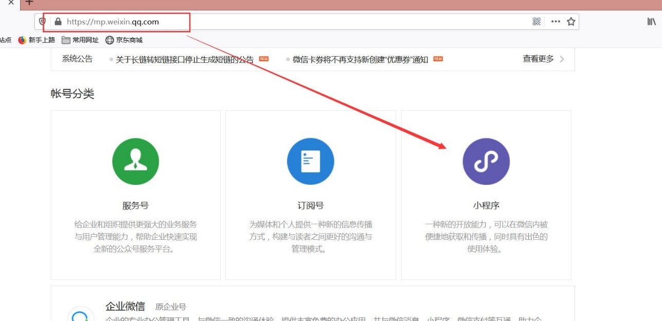 打开并进入微信公众平台,然后在“账号分类”下找到小程序。
