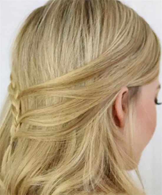 用蝎子辫的手法,编至耳朵后面时,变成三股辫