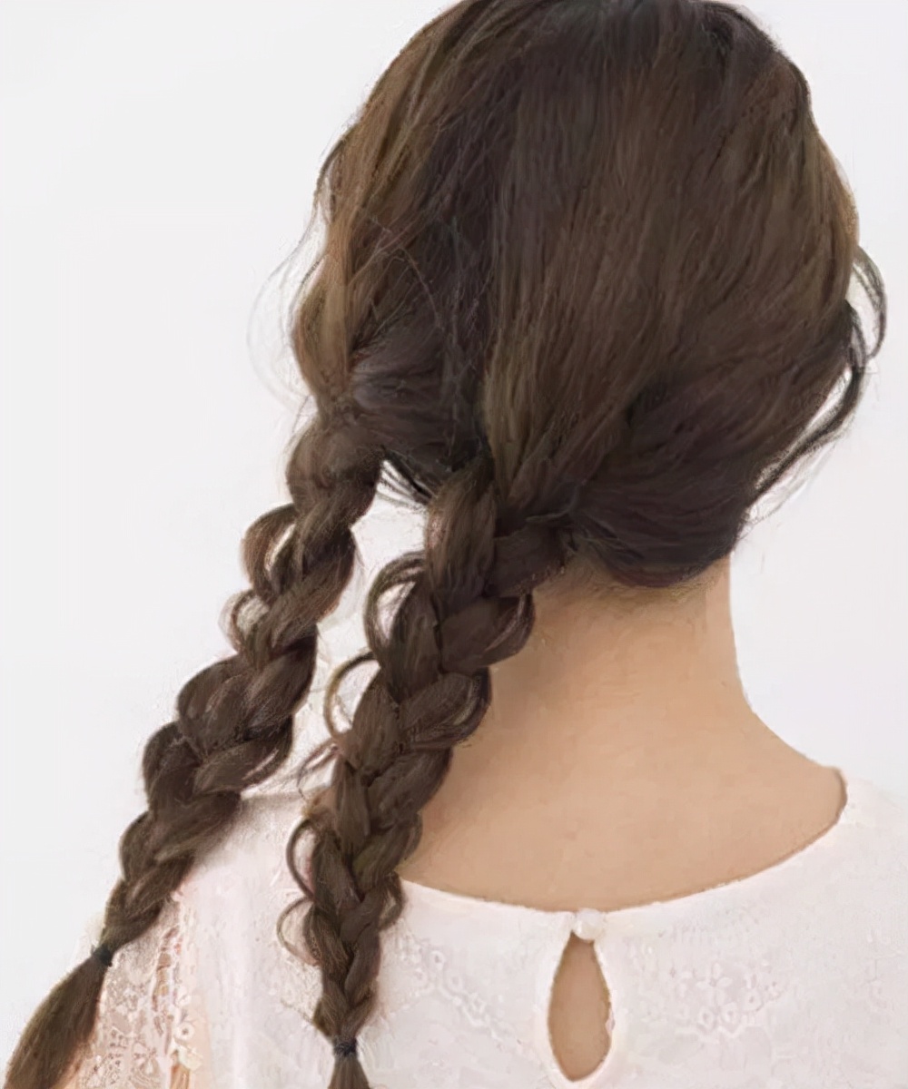 将两个麻花辫缠绕,最后用小绳子绑起来,可以的话在小绳子那里加个蝴蝶结等发饰点缀