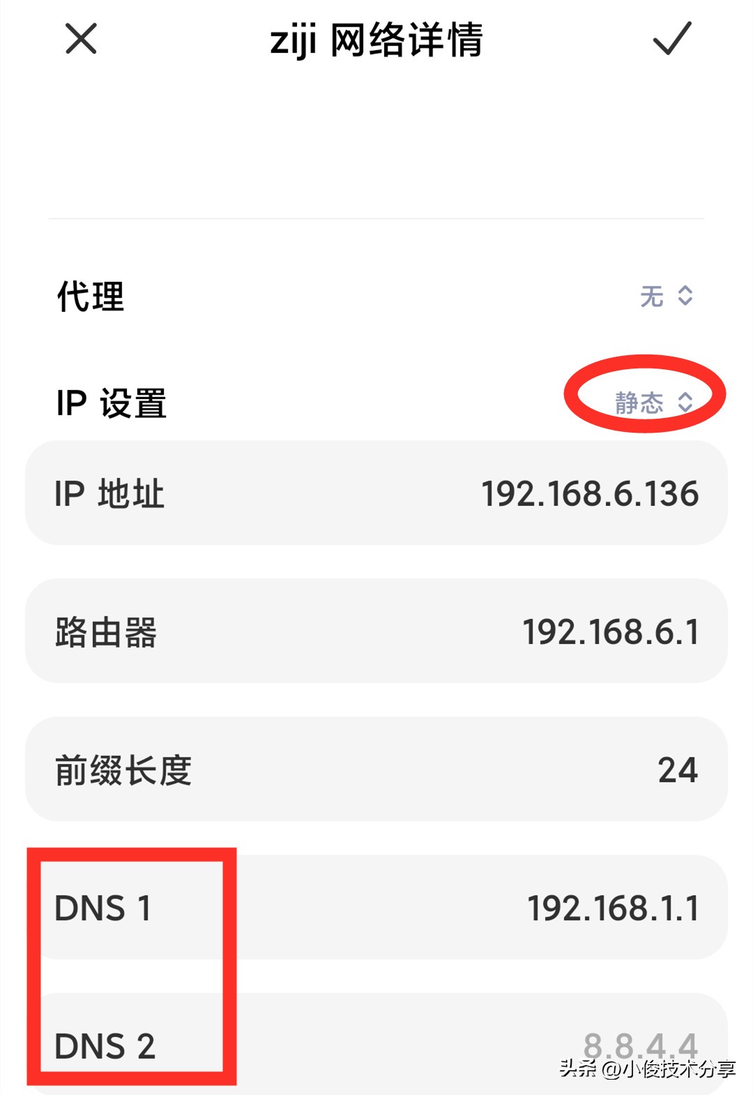 在这个详情页面中,我们往下滑动找到【DNS】,这个DNS啊,就是关键的数据了,那么什么是DNS呢,顾名思义,就是域名解析系统,当然在这里面你不要了解那么多,只需记住通过更改这个东西,能提升网速就可以了,如果说你的手机上网速度很慢,基本上就是因为这个DNS这里没有设置好,那怎样设置呢?也是非常简单的,我们点击一下IP设置,然后把它切换为【静态】,接着就可以看到下面的【DNS】了
