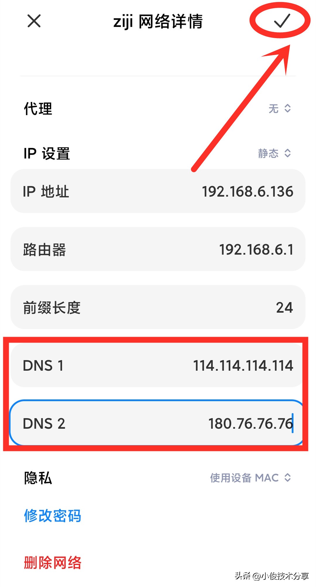 那么此时我们就需要对它们进行更改了,我们把【DNS1】更改为【114.114.114.114】,【DNS2】更改为【180.76.76.76】,修改完成之后,点击右上方的对勾,将它们保存起来!