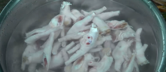 首先,我们准备适量的新鲜鸡爪剪掉指甲后对半剁开备用,由于市场上贩卖的大多都是冰冻鸡爪,挑选时最好选择无明显黑斑淤血的鸡爪。然后加入适量的清水将鸡爪浸泡六十分钟,这一步是为了去除鸡爪中残余的血水。