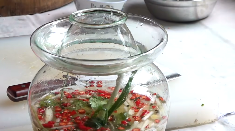 在浸泡鸡爪的等待期间,我们可以进行辅料的准备工作。先准备适量野山椒和小米辣切碎备用,不能吃辣的朋友可以不用切太碎。准备适量的仔姜切成姜片,几颗大蒜切成蒜片,几根芹菜切成小段放在一旁备用。然后将切好的辅料放入坛中,再加入适量的凉开水。之后加入适量的盐和白糖调味,此处白糖可以略微压过食用盐。再加入香菜和香葱各一根。如果喜欢花椒味的朋友还可以加入几颗青花椒增香。