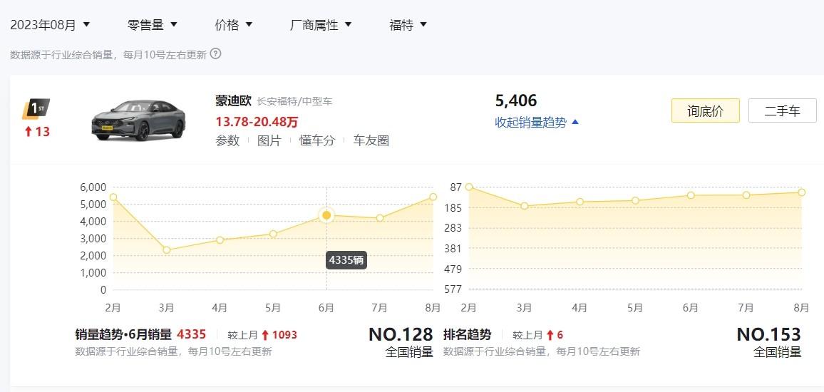 具体来看,3月蒙迪欧还只售出了2301辆新车,到了8月份,其便交出了一份5406辆新车的销量成绩单,直接翻了一倍还要多。由此可见,消费者对于新款蒙迪欧车系的喜爱和认可。