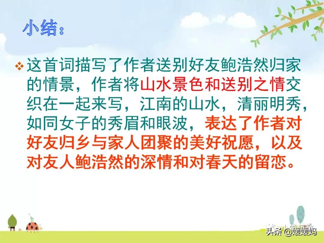 这首词通过描写词人送别好友鲍浩然归乡的情景,表达了词人对好友的美好祝愿,抒发了朋友间的依依惜别之情。